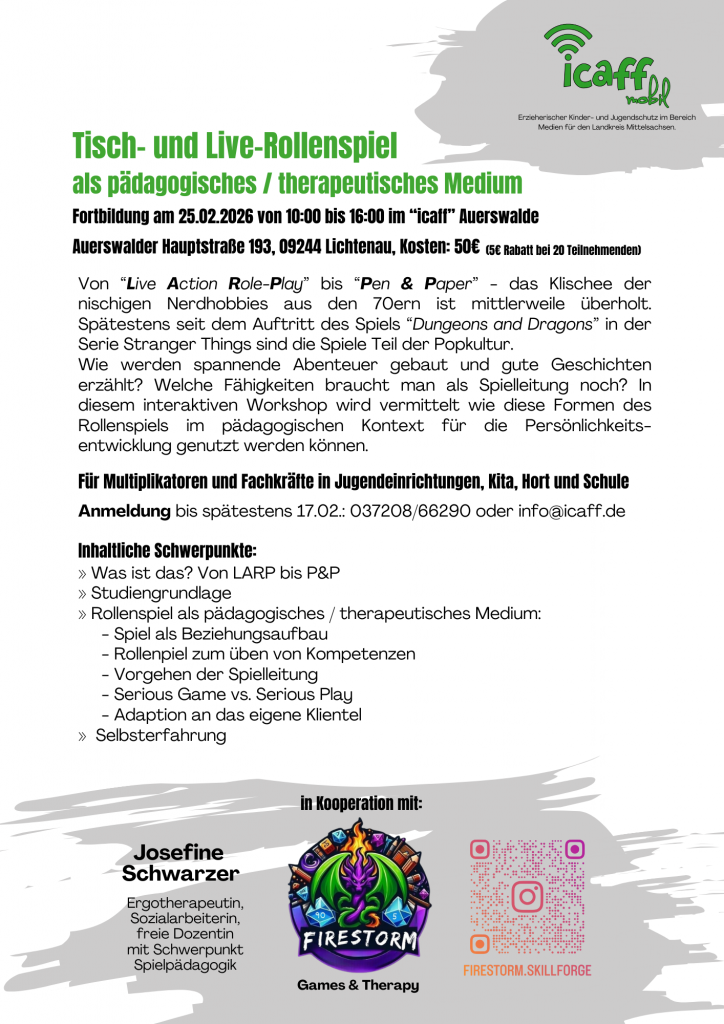 Außerdem ist sie im Projekt icaff mobil im Landkreis Mittelsachsen für den Erzieherischen Kinder- und Jugendschutz im Bereich Medien unterwegs.