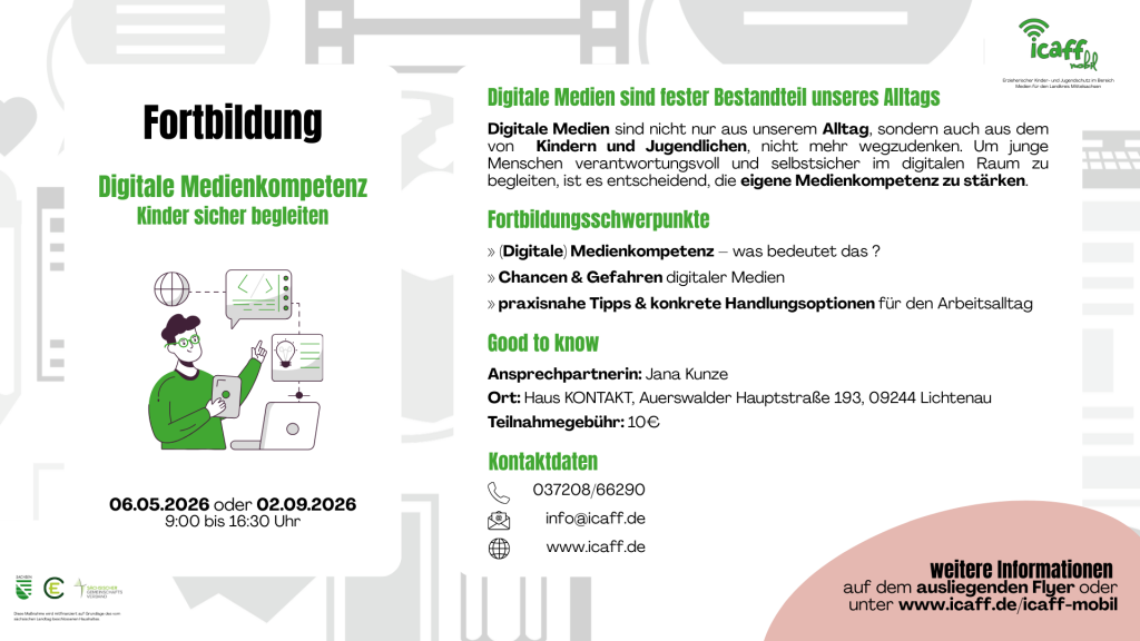 Das Thema „Medien“ steht im Rahmen des erzieherischen Kinder- und Jugendschutzes im Fokus unserer Arbeit. Deshalb arbeiten wir innerhalb des icaff individuell oder in kleinen Gruppen mit den Kindern und Jugendlichen in diesem Bereich. Als medienpädagogisches Projekt legen wir zudem besonders Wert auf den Medienschutz und die Herausbildung von Medienkompetenz. Auf Grund des Erfahrungsvorsprungs im Umgang mit neuen Medien sind Kinder und Jugendliche nur schwer für fakultative Angebote in diesem Bereich zu begeistern, welche einen klaren präventiven Ansatz verfolgen. Da es aber einige Themen innerhalb der neuen Medien gibt, welche klar angesprochen und präventiv behandelt werden müssen, ist es sinnvoll nach außen zu arbeiten und damit gezielt z.B. an Schulen und andere Einrichtungen zu gehen.